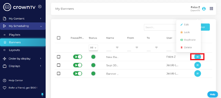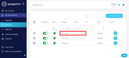 You can pause or play the banner by using the slider. The green circle in the Status column shows that the banner is active.